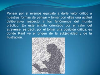 Este documento resume las ideas principales de Kant sobre la Ilustración, la moral y la educación. Kant cree que pensar por uno mismo y tomar una posición crítica es clave para salir de la minoría de edad. La moral kantiana se basa en que los seres racionales actúan según sus propios principios y pueden obrar libremente. Finalmente, Kant enseña que la educación es fundamental para lograr la autonomía a través del pensamiento crítico.