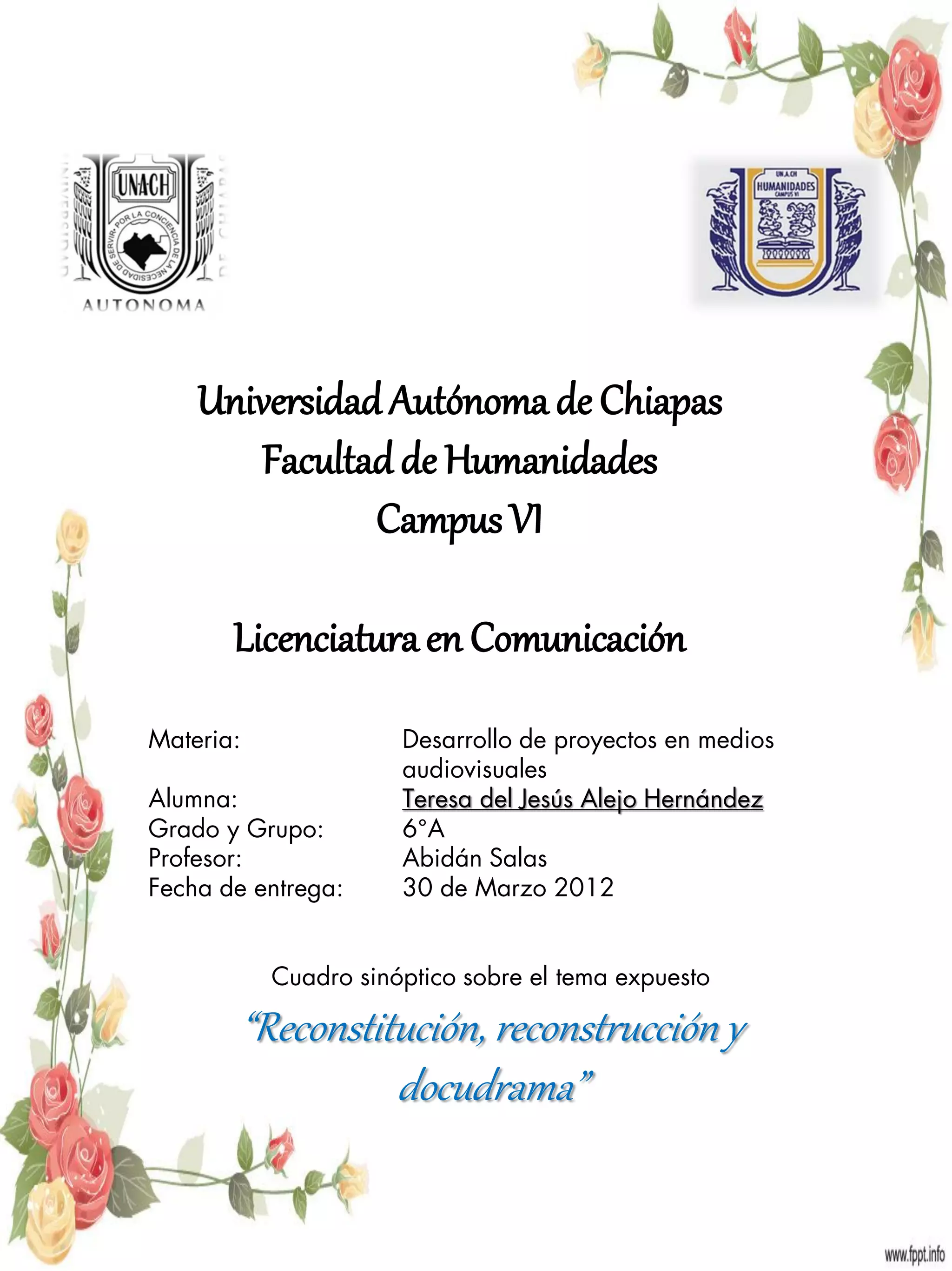 Este documento presenta un cuadro sinóptico sobre la reconstitución, reconstrucción y docudrama. Define la reconstitución como la reconstrucción de escenas importantes que no pueden ser mostradas de otra manera para estimular la imaginación del público. Explica que el docudrama es una dramatización de la realidad de la vida. Finalmente, menciona algunos ejemplos de películas falsos documentales o "burlamentales" que desconciertan al público al revelar que los protagonistas son actores.