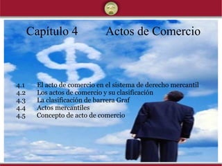 Este documento describe los diferentes tipos de actos de comercio y cómo se clasifican. Explica que un acto de comercio es una manifestación de voluntad que tiene como propósito producir consecuencias jurídicas. Luego describe las clasificaciones de actos de comercio absolutamente mercantiles, de mercantilidad condicionada, atendiendo a su finalidad, por alguna de las personas involucradas y por su objeto. También cubre la clasificación de Barrera Graf y define conceptos como actos mercantiles y el concepto de acto de comercio