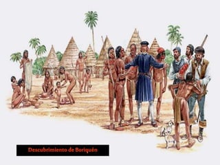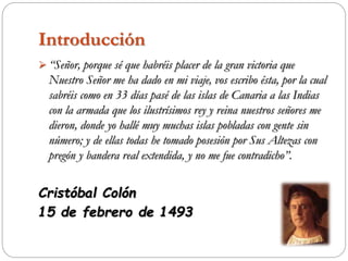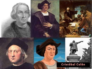 Cristóbal Colón realizó cuatro viajes a las Américas entre 1492 y 1504, descubriendo nuevas tierras para la Corona Española. En su primer viaje en 1492, zarpó de Palos, España con tres carabelas y llegó a una isla de las Bahamas el 12 de octubre, aunque creyó haber llegado a Asia. Luego exploró Cuba y La Española, donde dejó una guarnición antes de regresar a España en triunfo. Sus viajes posterior llevaron al descubrimiento de más territorios en