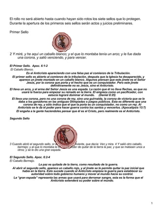 Este documento resume los seis primeros sellos del Apocalipsis 6. Cada sello representa una nueva calamidad enviada por Dios durante la Gran Tribulación: 1) el Anticristo aparece con falsa paz, 2) guerra estalla en la tierra, 3) hambre debido a la guerra, 4) muerte afecta a un cuarto de la población mundial, 5) almas de mártires claman venganza, 6) terremotos y desastres naturales sacuden la tierra.