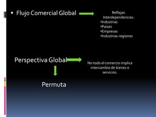Este documento resume los principales conceptos relacionados con el comercio global y el marketing internacional. Explica cómo el comercio mundial refleja la interdependencia entre industrias, países, empresas y regiones. También describe las tendencias clave que afectan el panorama del marketing mundial, como la disminución del proteccionismo, la integración económica y la competencia global entre empresas. Finalmente, analiza factores ambientales como las consideraciones culturales, económicas, políticas y regulatorias que los mercadólogos globales deben considerar.