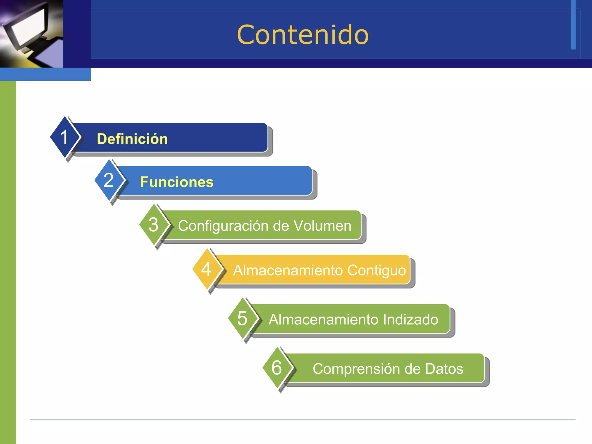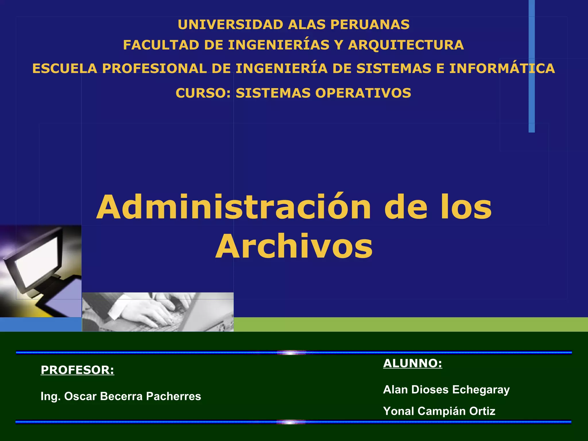 El documento habla sobre la administración de archivos en sistemas operativos. Explica que el administrador de archivos es el software responsable de crear, eliminar, modificar y controlar el acceso a los archivos. También administra los recursos del sistema como el almacenamiento de archivos de manera contigua o indexada. Describe funciones como llevar el control de la ubicación de los archivos y asignarlos cuando los usuarios solicitan acceso.