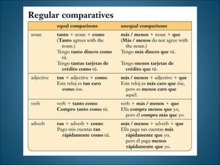 Este documento contiene instrucciones y actividades para varias lecciones de español. Incluye ejercicios gramaticales sobre comparativos y pretérito, así como situaciones de role-playing sobre una tienda y una conversación de compras en el pasado. También proporciona una tabla para hacer comparaciones sobre artículos de ropa.