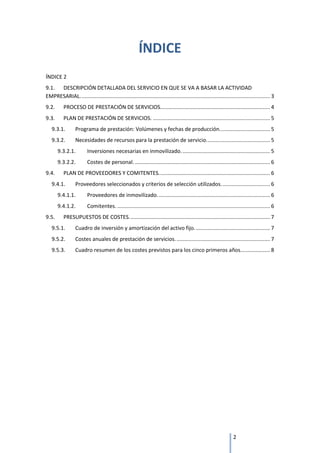 El documento presenta el plan de marketing de una empresa de organización de bodas. Describe el servicio ofrecido y el proceso de prestación. Incluye el programa de producción basado en fechas clave como primavera y verano. Detalla los recursos necesarios como equipamiento y costes de personal. Presenta una lista de posibles proveedores y comitentes con los que trabajar. Finalmente, incluye un presupuesto de costes para los primeros cinco años de actividad.