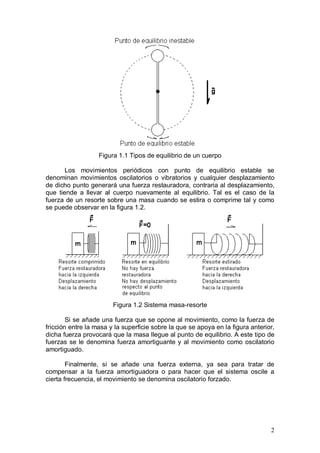 Este documento describe los aspectos generales del movimiento periódico y oscilatorio, incluidos ejemplos comunes en la naturaleza como el movimiento de un péndulo o una masa sujeta a un resorte. Luego, se enfoca en describir el movimiento armónico simple (MAS), cuya característica fundamental es que la fuerza restauradora es proporcional al desplazamiento. Finalmente, analiza la cinemática de un MAS, relacionando la posición, velocidad y aceleración a través de funciones coseno y seno