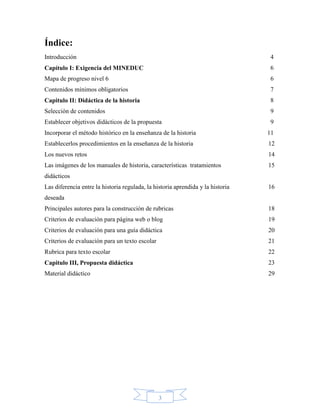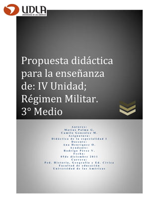 Este documento presenta una propuesta didáctica para la enseñanza de la cuarta unidad sobre el régimen militar en tercero medio. Se basa en los lineamientos curriculares del MINEDUC, incluyendo los mapas de progreso y contenidos mínimos obligatorios. Incorpora un marco teórico sobre la enseñanza de la historia y métodos didácticos. Finalmente, propone materiales y actividades para abordar el régimen militar desde 1973 a 1989 en Chile.