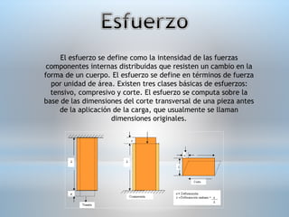 El documento describe los diferentes tipos de esfuerzos y deformaciones que pueden ocurrir en un material. Explica que existen tres tipos principales de esfuerzos: tensión, compresión y corte. También describe las deformaciones elásticas y plásticas que un material puede experimentar cuando se aplica un esfuerzo. Además, introduce conceptos clave como módulo de elasticidad y límite de elasticidad.