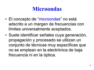 El documento trata sobre la teoría electromagnética aplicada a las microondas, definiendo que son ondas electromagnéticas con frecuencias entre 3 GHz y 300 GHz. Se discuten sus aplicaciones en radiocomunicaciones, radar y medicina, y la importancia del diseño de antenas y líneas de transmisión para maximizar la velocidad de datos en sistemas de microondas. Además, se abordan conceptos fundamentales de la teoría de circuitos y las ecuaciones de Maxwell que son relevantes para la ingeniería de microondas.