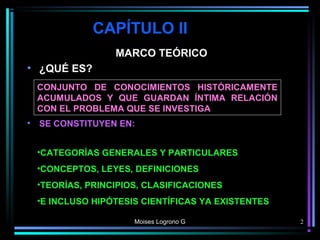 Este documento presenta una introducción al marco teórico de un proyecto de investigación. Explica que el marco teórico consiste en los conocimientos históricamente acumulados relacionados con el problema de investigación, incluyendo teorías, conceptos, definiciones y categorías. Además, detalla los elementos que componen el marco teórico como los antecedentes, la fundamentación teórica, legal y conceptual, el sistema de variables y la definición de términos.