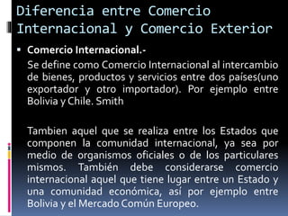 1) El documento explica la diferencia entre comercio internacional y comercio exterior, siendo el comercio internacional el intercambio entre países mientras que el comercio exterior se refiere al comercio de un país particular con otros.
