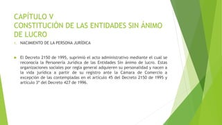 Este documento describe los pasos para constituir una entidad sin ánimo de lucro en Colombia. Explica que estas entidades adquieren personalidad jurídica a través de su registro en la Cámara de Comercio. Detalla los requisitos para la constitución como la escritura pública o documento privado, y el contenido mínimo del acta de constitución. Además, explica que los estatutos son la base normativa y deben incluir aspectos como el nombre, objeto, órganos de dirección y administración.