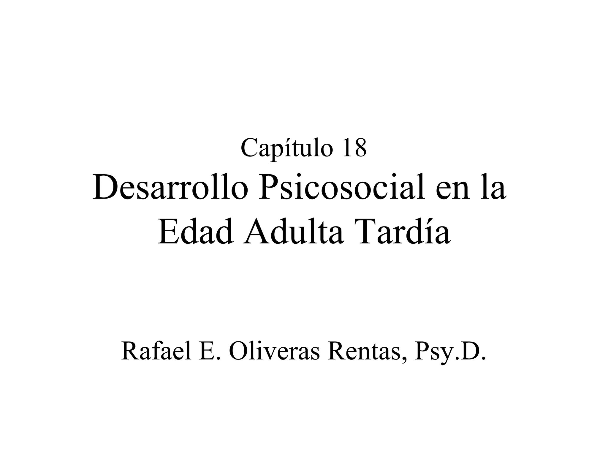 Este documento resume varias teorías sobre el desarrollo psicosocial en la vejez tardía. Habla sobre la necesidad de aceptar la propia vida y muerte próxima, redefinir la identidad más allá del trabajo, y encontrar satisfacción más allá del cuerpo físico. También discute factores como las relaciones interpersonales, la actividad, y el rol de abuelo como predictores de un envejecimiento exitoso.