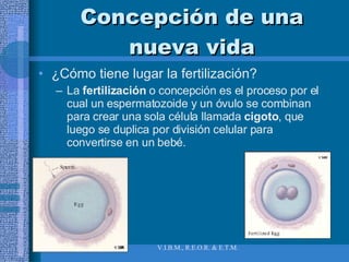 El documento resume los principales procesos de la concepción, el desarrollo prenatal y la herencia genética. Explica que la fertilización ocurre cuando un óvulo y un espermatozoide se unen para formar un cigoto, el cual se divide y desarrolla a través de las etapas germinal, embrionaria y fetal hasta el nacimiento. También describe cómo se transmiten y expresan los genes a través de patrones como la dominancia y la herencia ligada al sexo, y los factores que influyen en el desarrollo prenatal como la nut