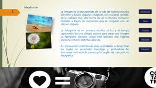 Este documento presenta una webquest sobre fotografía creativa. Los estudiantes deben investigar las funciones básicas de la cámara y las reglas de composición fotográfica a través de varios recursos en línea. Luego, cada estudiante tomará 25 fotografías aplicando estas técnicas y las organizará en una galería en línea. Finalmente, presentarán y evaluarán sus experiencias en clase.