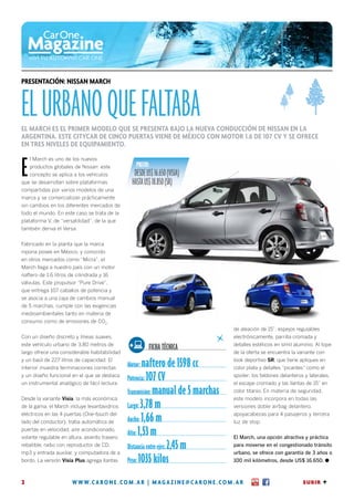 El documento presenta el nuevo Nissan March, el Fiat Grand Siena actualizado, y los recién llegados Chevrolet Sonic y Peugeot 508. También analiza la variante más potente de la pick-up Volkswagen Amarok, anticipa el próximo Fiat Grand Siena, y realiza una prueba de manejo del deportivo Renault Mégane III RS.