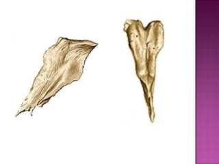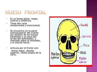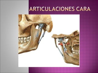 El documento describe diferentes huesos de la cabeza y cara como el frontal, maxilar superior, palatino y nasal, así como sus características y articulaciones. También describe los músculos faciales como el orbicular de los ojos, elevadores de la nariz y comisuras labiales. Por último, menciona la articulación temporomandibular entre el hueso temporal y la mandíbula, sus movimientos y ligamentos.