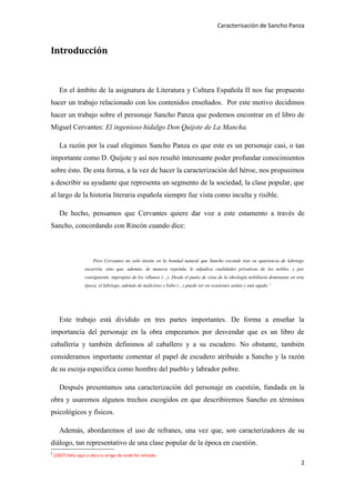 Este documento resume la caracterización del personaje de Sancho Panza en la obra de Cervantes "El ingenioso hidalgo Don Quijote de La Mancha". Primero, explica los orígenes de los libros de caballería y define los roles de caballero andante y escudero. Luego, caracteriza a Sancho Panza como un hombre del pueblo elegido por Don Quijote para ser su escudero. Finalmente, analiza cómo Cervantes usa a Sancho para parodiar los tópicos de los escuderos en los libros de caballería de la época.