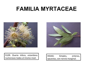 Este documento presenta las características diagnósticas de numerosas familias de plantas. Describe aspectos como la morfología de las flores, hojas, tallos y frutos. Algunas familias comparten características como hojas simples y alternas, ausencia de látex o presencia de estipulas. Cada familia presenta una combinación única de estas características que permite su identificación.
