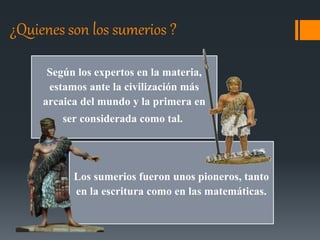 Los sumerios representan la civilización más antigua del mundo, pioneros en escritura y matemáticas. Su lengua, el sumerio, fue la primera lengua escrita conocida y presenta características aglutinantes y parcialmente ergativas. Se clasifica en varias etapas, desde el sumerio arcaico hasta el post-sumerio.