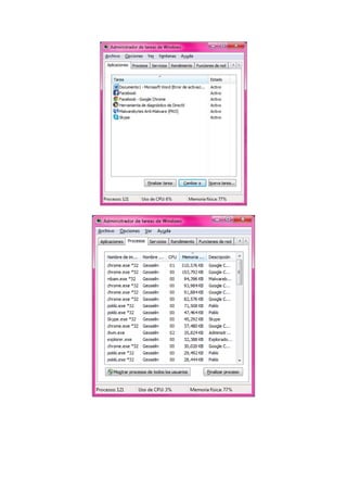 Este documento describe las características de un equipo con un procesador Intel Core i3-2370M de 2.40GHz y 4GB de RAM. Luego proporciona definiciones y detalles sobre los diferentes tipos de microprocesadores, incluidos Intel Celeron, Intel Core 2 Duo, Intel Core 2 Quad, Intel Core i3, Intel Core i5, Intel Core i7 e Intel Atom, así como AMD Phenom II, AMD Athlon II X2 y AMD Sempron.