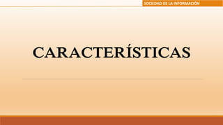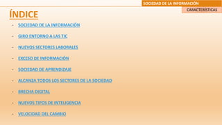 La sociedad de la información se caracteriza por girar en torno a las tecnologías de la información y la comunicación (TIC), lo que da lugar a nuevos sectores laborales y tipos de inteligencia. Abarca todos los sectores de la sociedad e implica un aprendizaje continuo, aunque también conlleva desafíos como el exceso de información, la brecha digital y la velocidad del cambio.