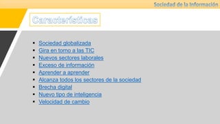 El documento discute cómo la sociedad globalizada y las tecnologías de la información y la comunicación (TIC) han transformado la economía, la sociedad y la cultura a nivel mundial. Las TIC ahora están presentes en todos los aspectos de la vida, incluida la educación, el trabajo y el ocio. Si bien las TIC ofrecen nuevas oportunidades, también plantean desafíos como la saturación de información, la brecha digital y la necesidad de desarrollar nuevas habilidades para hacer frente al rápido cambio tecnológico.
