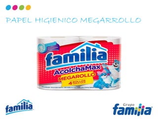 El documento describe las características externas e internas del papel higiénico Megarrollo. Sus características externas incluyen ser de color blanco, triple hoja, tener embosing en las hojas, aroma, ser grueso y de textura suave, y tener un empaque rojo con el logotipo y osos. Sus características internas son que el papel está fabricado con papel reciclado y pulpa virgen.