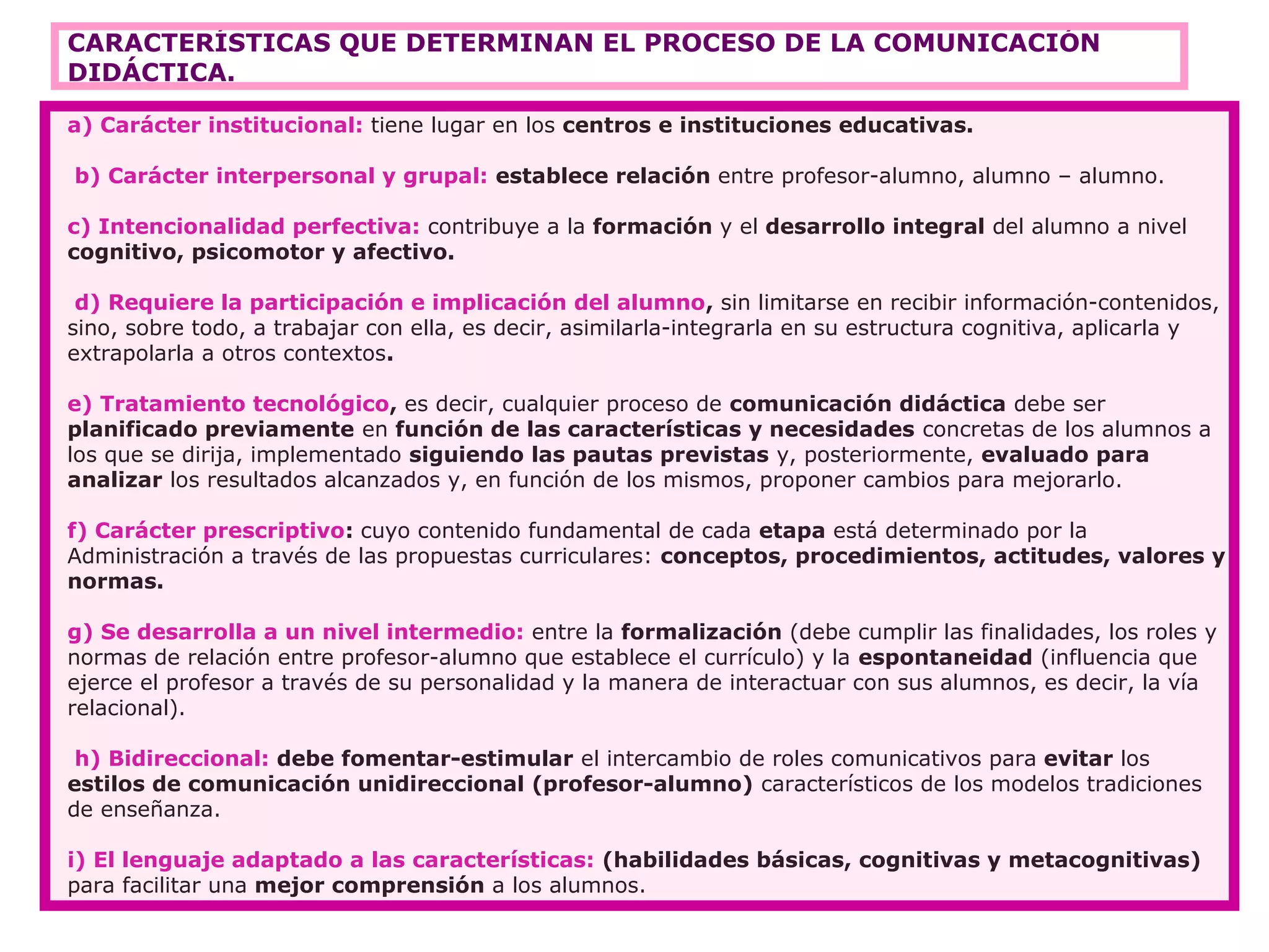 La comunicación didáctica se caracteriza por ocurrir en instituciones educativas, establecer relaciones interpersonales entre profesores y alumnos, y contribuir al desarrollo integral de los alumnos. Además, requiere la participación de los alumnos, un tratamiento tecnológico planificado de acuerdo a las necesidades de los estudiantes, y promover el intercambio bidireccional de roles comunicativos entre profesores y alumnos.