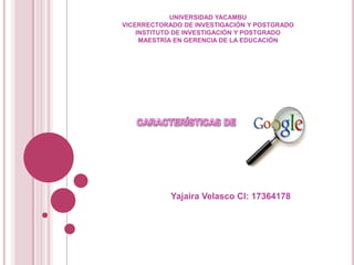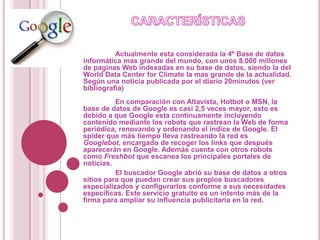 Este documento describe la base de datos de Google, la cual es la cuarta más grande del mundo con aproximadamente 8 mil millones de páginas web indexadas. Google constantemente actualiza su índice mediante robots que rastrean la web de forma periódica. Además de su base de datos web, Google incorpora otras bases de datos para servicios como Google Groups, Google News, Google Catalogs y Google Scholar.