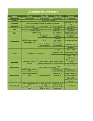 El documento resume las características clave de los modelos iPhone, iPhone 3G, iPhone 3GS e iPhone 4. Los modelos iPhone y iPhone 3G ya no están en producción, mientras que los modelos iPhone 3GS e iPhone 4 siguen en producción. Las principales mejoras entre los modelos incluyen pantallas más grandes con mayor resolución, más memoria, procesadores más rápidos, cámaras mejoradas y funciones adicionales como GPS y control de voz.