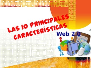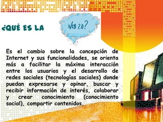 El documento describe las características clave de la Web 2.0, incluyendo que es más interactiva y dinámica permitiendo una mayor participación de los usuarios a través de herramientas como blogs, wikis y redes sociales; que los servicios de software son accesibles en línea en lugar de instalarse localmente; y que los usuarios pueden expresarse, opinar, buscar información, construir conocimiento y compartir contenidos.