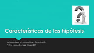 La hipótesis es una proposición tentativa para responder un problema de investigación que se pone a prueba para determinar su validez. Las hipótesis deben referirse a situaciones reales, tener variables claras, observables y medibles, y una relación lógica entre variables. Además, deben estar relacionadas con técnicas disponibles para probarlas.