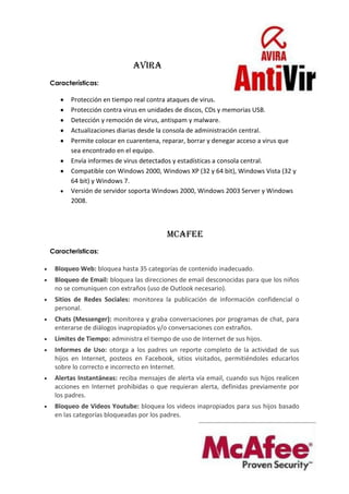 Este documento describe las características de varios antivirus gratuitos y de pago. Incluye información sobre Kaspersky, Avira, McAfee, Norton, Clamwin, AVG, Avast e Iobit, destacando sus capacidades de detección y eliminación de virus, actualizaciones automáticas, y funciones de protección en tiempo real y escaneos periódicos.