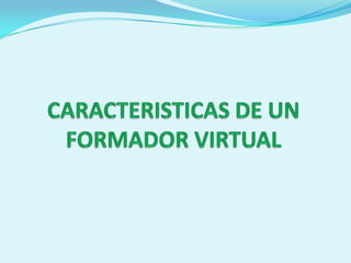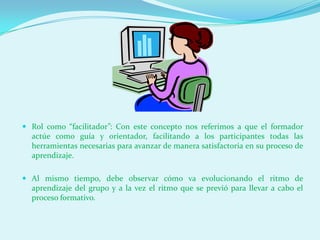 El documento describe los diferentes roles que debe desempeñar un formador en un curso virtual, incluyendo facilitar las herramientas de aprendizaje, observar el ritmo de aprendizaje del grupo, gestionar las actividades del curso, conocer los recursos de Internet, organizar y planificar los objetivos y contenido del curso, administrar los tiempos y participación, resolver problemas técnicos básicos, crear un entorno de aprendizaje positivo, y comunicarse de manera efectiva por escrito.