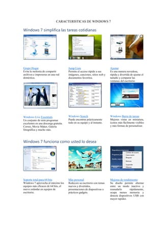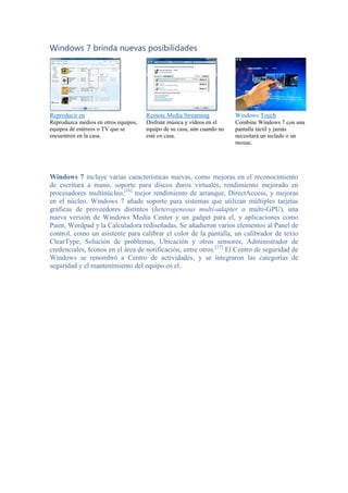 Windows 7 ofrece mejoras en la facilidad de uso y personalización, mayor rendimiento y nuevas funciones como soporte para pantallas táctiles. Permite compartir archivos e impresoras de forma sencilla, encontrar rápidamente cualquier archivo, personalizar el escritorio con temas y gadgets, y reproduce contenidos multimedia en otros dispositivos de la red doméstica.