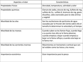 Este documento describe las características del agua en los océanos, ríos, lagos y aguas subterráneas. Explica las propiedades físicas y químicas del agua, así como su movilidad a través de las olas, mareas y corrientes marinas. También destaca la importancia económica del agua.