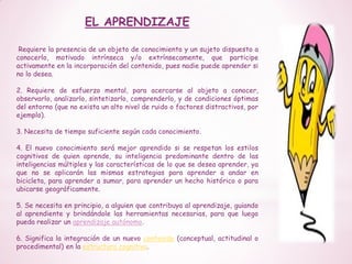 El documento describe los diferentes tipos y características del aprendizaje. Explica que el aprendizaje requiere un sujeto motivado y esfuerzo mental, y puede ser receptivo, por descubrimiento, repetitivo, significativo o por reforzamiento. También se aprende por observación de modelos o de forma combinada entre lo presencial y virtual. El aprendizaje se caracteriza por ser un proceso complejo, adquisitivo, susceptible de manifestarse en el futuro y formativo para el estudiante.