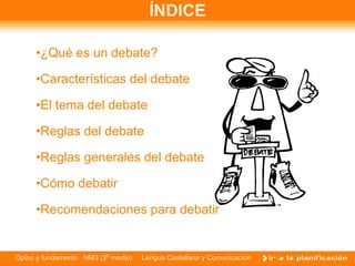 El documento describe las características de un debate formal. Un debate involucra a dos grupos que defienden posiciones opuestas sobre un tema polémico. Los participantes deben prepararse bien y seguir reglas como turnos de habla y respeto mutuo. Un debate exitoso requiere que los participantes escuchen activamente, hablen con confianza pero sin imponer su punto de vista, y consideren diferentes perspectivas.