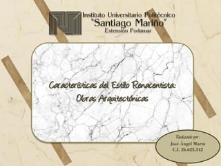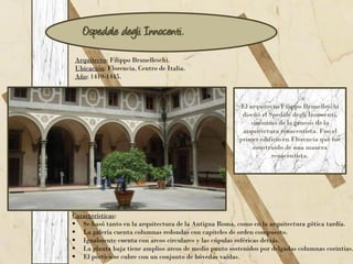 El documento describe cinco obras arquitectónicas renacentistas: el Ospedale degli Innocenti en Florencia, el Convento de San Esteban en Salamanca, el Schloss Johannisburg en Alemania, el Castillo de Rosenborg en Dinamarca, y sus características arquitectónicas como el uso de columnas, arcos, bóvedas y detalles inspirados en la antigua Roma y la arquitectura gótica tardía.