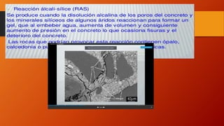 Este documento discute las propiedades químicas de los agregados finos y gruesos utilizados en el concreto. Explica que los cloruros y sulfatos deben estar por debajo de ciertos límites para evitar la corrosión del acero de refuerzo o daños al concreto. También describe la reacción álcali-agregado y formas de controlarla, como usar cementos con menos álcalis, agregados no reactivos, y aditivos como puzolanas.