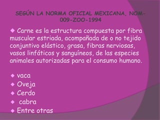 Este documento describe las características sensoriales de diferentes tipos de carnes como la vacuna, cerdo, borrego y cordero. Explica que la apariencia, color, olor y textura de la carne dependen de factores como la especie, raza, edad y alimentación del animal. También identifica características aceptables y de rechazo para cada tipo de carne y señala que la contaminación puede ocurrir desde el sacrificio del animal en el matadero.