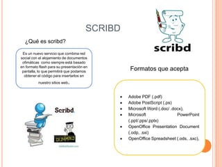 Este documento resume las características principales de varias plataformas para compartir documentos y contenido multimedia en línea como Scribd, SlideShare, Issuu, YouTube y Flickr. Scribd permite alojar y compartir documentos de oficina como PDF, Word y PowerPoint. SlideShare se enfoca en presentaciones mientras que Issuu se centra en revistas digitales. YouTube es popular para videos y Flickr para fotografías. Cada plataforma tiene ventajas como ser gratuita pero también limitaciones como capacidad de almacenamiento.