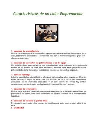 Un líder emprendedor se caracteriza por tres cualidades principales: 1) la capacidad de acompañar procesos de principio a fin con compromiso; 2) aprovechar sus propias potencialidades y las de su equipo; y 3) adaptar su estilo de liderazgo a diferentes situaciones usando las herramientas adecuadas.