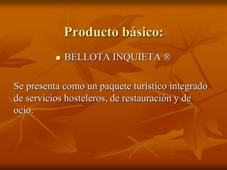 El documento describe el paquete turístico "BELLOTA INQUIETA ®" que incluye servicios hoteleros, de restauración y ocio en Plasencia y Monfragüe. Incluye alojamiento en dos hoteles, un restaurante, un paseo en globo y seguros. Además, al finalizar la experiencia se regalará un DVD y el cliente será incluido en el fichero para ofertas futuras con el fin de fidelizarlos.