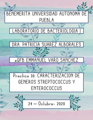 El documento presenta un protocolo para la identificación del género Streptococcus y Enterococcus, basado en diversas pruebas microbiológicas. Se describe la caracterización de colonias, la aplicación de pruebas específicas y la identificación de la especie, destacando Streptococcus pyogenes y su asociación a diferentes enfermedades. También se abordan aspectos clave de la morfología, metabolismo y pruebas de sensibilidad de estos microorganismos.