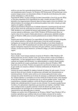 Windows XP Professional ofrece una experiencia informática más fiable y estable que versiones anteriores de Windows gracias a mejoras como un comprobador de controladores de dispositivos más riguroso, menos escenarios que requieren reinicios, y protección mejorada de códigos y archivos. Además, proporciona un entorno de usuario más fácil de usar y adaptable, así como mayores niveles de seguridad, rendimiento y capacidades multimedia.