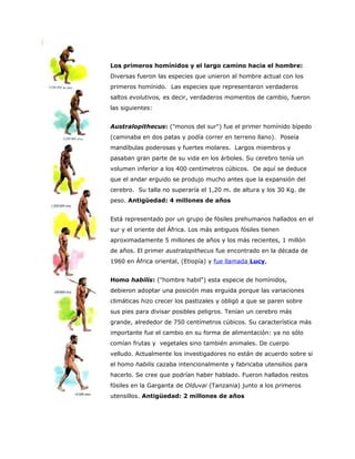 El documento describe las características básicas de los primates, incluyendo manos y pies con cinco dedos, pulgares oponibles, clavículas presentes, uñas planas y visión binocular. Explica que los primeros primates surgieron hace 70 millones de años y que especies como Australopithecus, Homo habilis, Homo erectus y Homo sapiens representaron saltos evolutivos importantes hacia el Homo sapiens moderno.