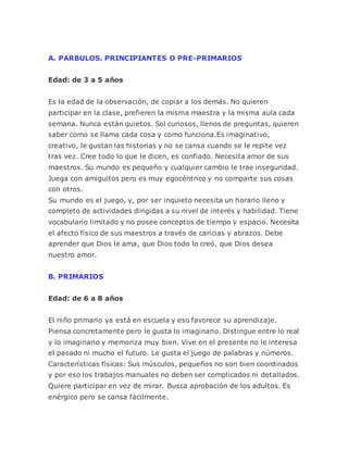 Este documento describe las características físicas, mentales, sociales y espirituales típicas de los niños en diferentes edades, dividiéndolos en cuatro grupos: parvulos (3-5 años), primarios (6-8 años), primarios superiores (9-11 años) e intermedios (12-14 años). Explica que cada grupo tiene intereses y capacidades diferentes que deben ser consideradas para enseñarles de manera efectiva. También enfatiza la importancia de que los maestros conozcan bien las características de cada grupo