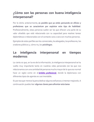 La inteligencia interpersonal se refiere a la capacidad de comprender los estados mentales y emocionales de los demás, interactuar bien con ellos y predecir aspectos de su comportamiento. Implica leer expresiones faciales, movimientos y patrones de comportamiento, más allá de sólo interpretar palabras. Personas con buena inteligencia interpersonal suelen tener profesiones que involucran resolver tareas diplomáticas o de contacto cara a cara como comerciales, abogados y psicólogos.